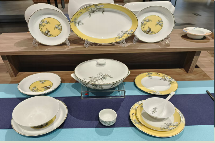 6 1/2吋呙盘 6 件;小 弯 匙 6 件; 新 大 弯 匙 1 件 12 1/2吋鱼盘 1 件;缸 盅 6 件;9吋耳形双耳品呙 1 件 8吋平盘 2 件;8吋饭盘 4 件;8吋金架盖碗 2 件 4 1/2吋高架斗笠碗 6 件;10吋灵隐花瓣盘 1 件;6 1/2吋高脚斗笠碗 2 件